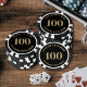 These custom poker chips feature bold faux foil text with a number and wording printed on both sides, creating a clean, elevated look with the appearance of metallic foil while remaining a flat printed design. Each side can be personalized with any number up to four digits, along with custom text to match your event or style.