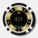 Les puces de poker mariage en noir et or sont conçues avec des noms personnalisés, des dates et des montants en dollars.