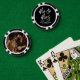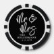 These custom poker chips feature a clean black background on one side with all text in white for a classic and elegant look. “Mr. & Mrs.” appears in large white handwritten script, with the couple’s last name and wedding date placed directly below in a refined white serif font for a balanced finish. The other side can feature a favorite photo of your choice, keeping the design personal and memorable.