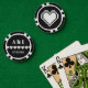 Offrez aux invités, aux demoiselles d'honneur, aux groomsmen, ou à toute autre personne qui assistera ou aidera avec votre mariage geek ou événement spécial un plaisir amusant avec ces jetons de poker personnalisables. Un côté de la puce de poker présente un coeur pixélisé blanc sur un arrière - plan noir onyx profond. L'autre côté dispose d'un ensemble d'exemples d'initiales et de date séparées par un motif de jeu vidéo rétro lié aux coeurs 8 bits. L'exemple de texte peut être customisé avec vos propres détails ou un message spécial de votre choix pour créer un jeton unique et personnel pour commémorer votre grand jour. Ce design correspond à n'importe quel produit de la gamme Our 8 bits Hearts in Black afin que vous puissiez rendre votre jeu thème mariage ou événement spécial aussi coordonné que vous le souhaitez.