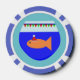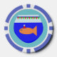 Cet ensemble impressionnant de puces de poker présente un poisson rouge de Noël orange amusant portant un chapeau santa festif. Le poisson rouge nage dans l'eau bleue de son bol de poisson rouge. Le poisson a décoré le haut du bol avec des drapeaux rouges et verts qui épellent le message "Merry Fishmas". Ce poisson de saison amusant est prêt pour une grande fête de Noël.