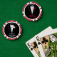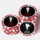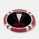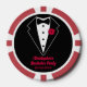 Jetons de poker amusants avec un smoking à cravate noire et un corsage de fleur de rose rouge pour personnaliser avec le nom du marié pour un jeu de poker de soirée d'enterrement de vie de garçon. Les cartes à jouer personnalisées font également un cadeau d'ouvreur de mariage amusant.