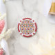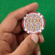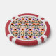 Two poker chips are shown, each featuring a floral pattern with orange, purple, and pink flowers against a white background, encircled by a bold red border.