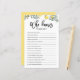 Qui connaît le mieux maman ? Ajoutez cette carte de jeu de baby shower botanique amusante et ludique à votre événement. Elle présente des illustrations aquarellées de citrons et de verdure. Vous pouvez personnaliser la carte en ajoutant des textes au dos. Cette carte de jeu de baby shower au citron est parfaite pour les baby showers de printemps et d'été.