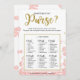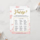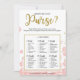Ce "Qu'est-ce qu'il y a dans votre sac" floral moderne présente un fond floral rose avec des éclaboussures de paillettes dorées. Le texte est écrit dans un mélange d'une police de calligraphie ludique et d'une police sans moderne, cette carte "Qu'est-ce qu'il y a dans votre sac" est personnalisée avec le nom de la future mariée et la date de la baby shower.