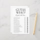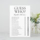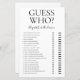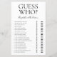 Cette charmante feuille de jeu moderne Guess Who? pour enterrement de vie de jeune fille est parfaite pour n'importe quelle fête. Ce jeu amusant et facile est sûr d'apporter beaucoup de rires à n'importe quelle fête de mariage. Il suffit de donner une feuille à chaque invité (n'oubliez pas les stylos) et laissez les rires commencer ! Vous serez étonné de voir combien de choses les gens savent sur les mariés. Pour personnaliser ce jeu, sélectionnez simplement "Personnaliser ce modèle" et tapez le nom de la mariée et le nom du marié.