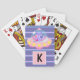 Ce joli Deck de cartes est sûr de faire de votre jeu un amoureux. Ce design est composé d'un mignon alien violet, semblable à une pieuvre, souriant dans un ovni rose avec des lumières clignotantes jaunes. Il y a un arrière - plan violet avec des rayures violettes claires qui sont bordées de bleu. Sous l'alien est un carré rose pour mettre votre monogramme.