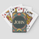 This card deck features a decorative Art Deco style design with the name JOHN centered in gold capital letters on a dark green background. The text is surrounded by a circular frame with symmetrical geometric patterns. The frame contains radiating sunburst designs in coral and yellow colors, with teal blue accents. The corners of the frame are decorated with circular motifs in coral and teal. The design has a symmetrical, balanced composition with curved and angular elements typical of Art Deco style. The color palette consists of dark green, coral red, yellow and teal blue, creating a vintage aesthetic. The text JOHN is in a serif font. The card deck contains 52 poker cards with 2 jokers. The cards are easy to shuffle.