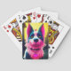 Ces cartes à jouer ont un chien de dessin animé rose dessus.