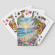 Pretty seaside coastal personalized playing cards with a gorgeous ai impasto oil painting style illustration of blue ocean waves crashing on a sandy beach, that is covered in sea glass and surrounded by palm trees at sunset and sunrise.