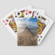 Pont de cartes avec torsion offrant une vue panoramique en grand angle sur une jetée à la plage.