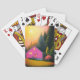 Ces cartes à jouer ont une maison rose sur elles.