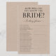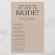 Cette charmante feuille de jeu de fête de mariage rustique 'Dans quelle mesure connaissez-vous la mariée ?' est simple et charmante - parfaite pour n'importe quelle fête. Ce jeu amusant et facile est sûr d'apporter beaucoup de rires à n'importe quelle fête de mariage. Il suffit de donner une feuille à chaque invité (n'oubliez pas les stylos) et laissez les rires commencer ! Vous serez étonné de voir combien de personnes connaissent certaines des réponses.
