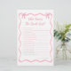 Faites de votre douche nuptiale une expérience inoubliable grâce à notre jeu de Fête des mariées personnalisé Pink Bow : Who Knows Bride Best. Parfait pour les idées de douche nuptiale à thème arc et le thème de la douche nuptiale à noeud, ce jeu ajoute une touche amusante à votre thème de douche nuptiale coquette. Idéal pour les idées de douches nuptiales roses, ce jeu de proue s'intègre parfaitement dans n'importe quel thème de douche nuptiale rose ou de douche nuptiale arc, ce qui en fait un must-have pour la cravate les idées de douche nuptiale et les jeux de douche nuptiale classiques.