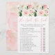 Ces élégantes cartes de jeu He Said She Said sont une activité amusante pour une Baby Shower. Il suffit de les faire circuler pendant la fête où les invités s'amuseront à deviner qui a dit chaque phrase. Vous pouvez même personnaliser les phrases ! Le design présente de belles fleurs aquarelles rose blush avec des accents de paillettes dorées. La calligraphie rose blush et le texte gris charbon complètent le beau design floral.