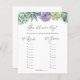 Carte de jeu de douche de mariage avec des plantes succulentes vertes et violettes aquarelles. Une façon amusante d'interagir avec les invités de la douche pour deviner l'âge de la mariée et du marié sur les photos.