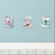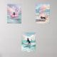 Cette collection enchanteresse de trois empreintes d'aquarelle apporte un charme côtier fantaisiste à votre maison. La première oeuvre d'art présente un chat noir flottant de manière ludique dans l'océan sur un char flamand pastel, portant des lunettes de soleil surdimensionnées contre des vagues pastel oniriques. La seconde montre un chat qui s'allonge confortablement sur une chaise en coquillages sous un parasol pastel, avec de douces vagues de l'océan et du sable doux qui complètent la vue sur la mer. La troisième impression capture un chat équilibrant sur une planche de surf pastel dérigeant dans des vagues turquoise, créant une scène sereine mais légère. Chaque pièce est peinte à coups de pinceau délicats dans des tons pastel doux, donnant à la collection un aspect cohésif et apaisant.