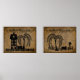 Silhouettes de style Prim, arrière - plan à l'ancienne grunge coloré et texturé avec des clôtures de piquets, des saules et des moutons et une vieille maison de style saltbox. Cherie's Art(c)2024