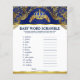 Jeux pour la baby shower du prince avec un mélange de mots de bébé d'un côté, et un quiz de comptines de l'autre. Cette affiche de jeu de baby shower royale en bleu et or est amusante et économique ! Vous pouvez changer les questions et les mots. Distribuez-les à vos invités en leur disant de ne pas regarder, puis lancez le chronomètre. Quand le temps est écoulé, lisez les réponses et la personne avec le plus de bonnes réponses gagne un prix.