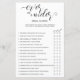 Obtenez une trouvaille fantastique avec cette carte de jeu 2-en-1 astucieuse ! Avec à la fois la carte de jeu de douche de mariage Over ou Under et Would She Rather, c'est économique. Ce design moderne et épuré complète sans effort n'importe quel thème. De plus, vous pouvez personnaliser entièrement le texte et même choisir une couleur de fond au-delà du blanc standard. Besoin d'aide pour la conception ou les articles de coordination, n'hésitez pas à nous contacter !
