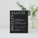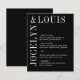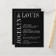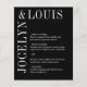 Menu mariage moderne avec un design noir minimaliste avec vos noms dans une grande police le long du côté gauche et du dessus. Cette conception est assez simple pour un mariage officiel tout en faisant une déclaration audacieuse.