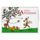 Joyeux Johnny Appleseed Day, carte de voeux papier. La carte présente une jolie illustration de Johnny Appleseed menant une ménagerie d'animaux et d'insectes tandis qu'il répand des graines de pommes sur le sol. Une grande branche de pommiers chargée de pommes rouges est derrière eux. Copyright © Shoaff Ballanger Studios.