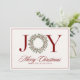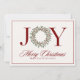 Design classique de carte de Noël avec le mot JOY en rouge festif et un centre de couronne de fêtes. Le dos de la carte est livré avec des salutations de Noël prêtes à l'emploi que vous pouvez garder ou customiser avec votre propre message personnel. Toutes les couleurs sont entièrement modifiables, de sorte que vous pouvez passer à l'or, vert, marine, ou toute ombre qui correspond à votre style de vacances. Une carte intemporelle et élégante pour envoyer des souhaits de vacances chaleureux à la famille, les amis et les collègues.