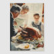 Cette image représente une scène de Thanksgiving classique qui rappelle les illustrations vintage. Elle met en scène une famille rassemblée autour d'une table de salle à manger, regardant avec joie un homme plus âgé découper une grande dinde rôtie dorée. La lumière chaude qui entre par la fenêtre illumine les visages des membres de la famille, soulignant leur bonheur et leur anticipation. La table est élégamment dressée avec un festin abondant, comprenant des raisins et des garnitures décoratives autour de la dinde. L'atmosphère générale évoque un sentiment de nostalgie, de chaleur et de célébration.