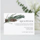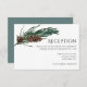 Jolies, élégantes et modernes cartes d'invitation de réception de mariage pour votre occasion spéciale ! Le design correspond au reste de la collection Christmas Joy. Parfait pour la période de fêtes de Noël, joyeuse et festive ! Une bordure de feuilles de pin vert foncé aquarelle avec des pommes de pin brunes encadre le coin supérieur gauche des détails de votre carte de réception de mariage, retournez la carte pour révéler un motif de fond de neige hivernale vert sauge. Personnalisez avec les détails de votre réception de mariage, y compris l'heure, le lieu et tout détail supplémentaire comme le stationnement ou le transport.