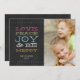 FUN JOY BLACK CHALKBOARD PHOTO DE VACANCES CARTE DE SALUT. ELKE CLARKE© POUR LA GALERIE MONOGRAM. Envoyez vos voeux de Noël à vos amis et votre famille en utilisant cette carte de vacances amusante avec photo. "JOIE, PAIX, AMOUR ET JOYEUX". Vous pouvez "customiser" et changer la couleur des mots pour correspondre à votre photo. Ajoutez votre propre photo, message de voeux et texte sur le devant de la carte, comme votre nom de famille, votre initiale monogramme ou vos prénoms. Vous avez le choix d'être créatif et de faire tout votre propre. AJOUTEZ PLUS DE TEXTE ET DE PHOTOS À L'ARRIÈRE DE LA CARTE SI VOUS LE SOUHAITEZ. Remplacez l'exemple de photo par votre portrait de Noël familial.