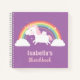 Le carnet de croquis est accompagné d'une licorne mignonne avec une crinière et une queue de couleur barbe à papa rose. Elle vole parmi l'arc-en-ciel, les nuages et les étoiles avec ses petites ailes. Personnalisez avec le nom de l'enfant dans le modèle de texte fourni.