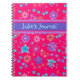 Un joli Carnet Spiral ou Journal pour vous de customiser, avec un motif de fleurs en violet, turquoise, rose et orange sur un arrière - plan rose rouge à lèvres, d'un collage de papier peint à la main par Judy Adamson. Vous pouvez facilement changer la couleur de l'arrière - plan, si vous le souhaitez, en utilisant le bouton Modifier.