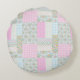 Un Coussin Rond chic ou Cushion, avec un joli motif de faux patchwork nostalgique de Dogroses roses sur un arrière - plan bleu ciel avec pois, rayures et plaids assortis. Faisant partie de la collection Posh & Painterly "Rosy Posy", ce motif peut être facilement ajusté pour s'adapter à n'importe quel Coussin ou coussin.