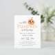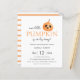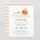 Invitation papier simple et moderne pour un baby shower Halloween avec une jolie citrouille sur un fond blanc propre. Avec les mots " notre petite citrouille est en route " et une alternance de pastel orange et blanc. Prêt pour une personnalisation facile.