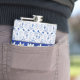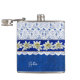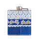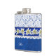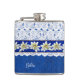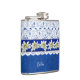 Jolie fiole de boisson faite en bleu sur le motif damassé bleu, avec des graphiques d'une dentelle blanche trop, sur la moitié supérieure de la fiole. Des graphiques d'un ruban bleu satiné, avec des fleurs blanches d'edelweiss, courent au milieu. Personnalisez le texte blanc, sur le devant, pour vous-même ou comme une idée cadeau de charme.