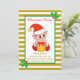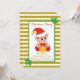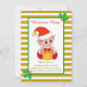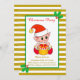 Joli elfe de Noël habillé en rouge sur invitation de Noël arrière - plan rayé d'or et blanc. Mignonne elfe bébé tenant une boîte cadeau sur arrière - plan blanc et doré. Le texte est prêt à être personnalisé.