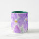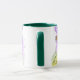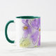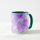 Mug blanc, décoré avec un aquarelle design de Blue Geraniums et avec une jante et poignée vert foncé.
