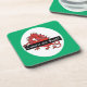 Un ensemble de carré, de Dessous de verre à dos de liège ou de Drink Mats à personnaliser, avec un mignon petit dragon rouge tenant une place pour ajouter votre nom ou autre texte.