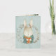 L'avant de cette carte présente un mignon lapin tiré à la main portant un manteau bleu et tenant une poignée de carottes orange vif. Il est entouré d'une couronne de printemps. L'arrière - plan est une couleur bleu oeuf de robin en détresse. L'intérieur a de belles fleurs printanières encadrant l'intérieur de la carte avec les mots "Pâques heureuse" placé au-dessus d'un nid d'oiseaux avec trois oeufs à l'intérieur.