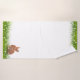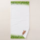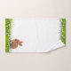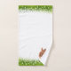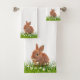 Joli lapin brun et des fleurs sur l'ensemble de serviettes de bain blanc. Lapin seulement d'un côté. Seules les fleurs sont des bicyclettes.