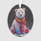 Ours polaire assis sur un fond sombre et étoilé. L'ours est représenté dans un motif coloré en style pointilliste qui lui donne une apparence ludique et fantaisiste. Il porte une écharpe orange vif qui ajoute de la chaleur à la scène. Le sol enneigé sous l'ours est également illustré avec une texture en pointillés, et les étoiles environnantes et les points colorés créent une atmosphère festive et hivernale. L'effet global est lumineux et joyeux, mêlant des éléments de la nature à l'expression artistique.