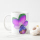 Cette tasse à café présente une photo d'une fleur sauvage de Pansy. La photo a été colorée artificiellement, ce qui donne un sansy avec des pétales violets rosâtres brillants avec des pétales à pointes vertes et un centre bleu profond. La fleur est de part et d'autre de la tasse. Le design est présenté ici sur une tasse à café blanc de base, mais est également disponible sur d'autres styles et couleurs de tasses, y compris de magnifiques tasses en verre dépoli et des tasses de voyage utiles.