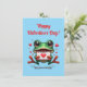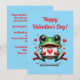 Une grenouille verte brillante et adorable assise tenant une carte de la Saint-Valentin, entourée de petits cœurs mignons. Les mots « Joyeuse Saint-Valentin ! » sont écrits de manière ludique avec des lettres amusantes au-dessus de la grenouille.