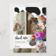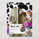 Carte de remerciement d'anniversaire sur le thème de la vache sacrée. Le design présente un fond à motif de vache noir et blanc, une arche de photo blanche, deux vaches mignonnes avec des coiffes florales aquarelles vives et audacieuses et un message de remerciement amusant.