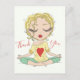 Merci avec un joli dessin animé d'une belle fille en position de lotus de yoga en méditation. Femme aux cheveux blonds avec de longs cils épais, chemise jaune avec un cœur rouge et pantalon de legging vert aqua à pois. Ouvrez votre chakra, Prenez soin de votre corps et de votre âme avec des méditations de yoga. Belle illustration féminine mettant en vedette la santé et pratiquant un mode de vie sain avec amour.