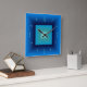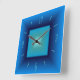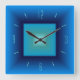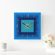 Une jolie horloge de cuisine bleue avec un centre aqua carré. Cette horloge est d'un design simple et comporte des chiffres.
