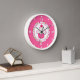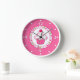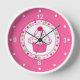 Horloge murale blanche, rose et verte, avec des graphismes d'un cupcake à l'intérieur d'un cercle de pois. Le nombre et les points sont faits en blanc. Customisez d'ajouter le texte que vous voulez. Ça fait une idée de cadeau.