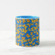 Un joli Ringer Mug avec une jante et une poignée bleue et un motif de Papillons d'or, peint à la main en aquarelle par Judy Adamson, sur un arrière - plan bleu ciel.
