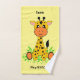 Cette serviette à main est munie d'une jolie girafe dessinée à la main, numériquement transformée. La petite girafe est jaune avec des points noirs et s'assoit dans l'herbe verte. Jolie serviette personnalisée pour les enfants ! Belle idée cadeau pour toute occasion! Conçu par Marions Artwork.