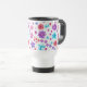 Un joli Travel Mug, avec un motif de fleurs en violet, turquoise, rose et orange sur un arrière - plan blanc, d'un collage de papier peint à la main par Judy Adamson.